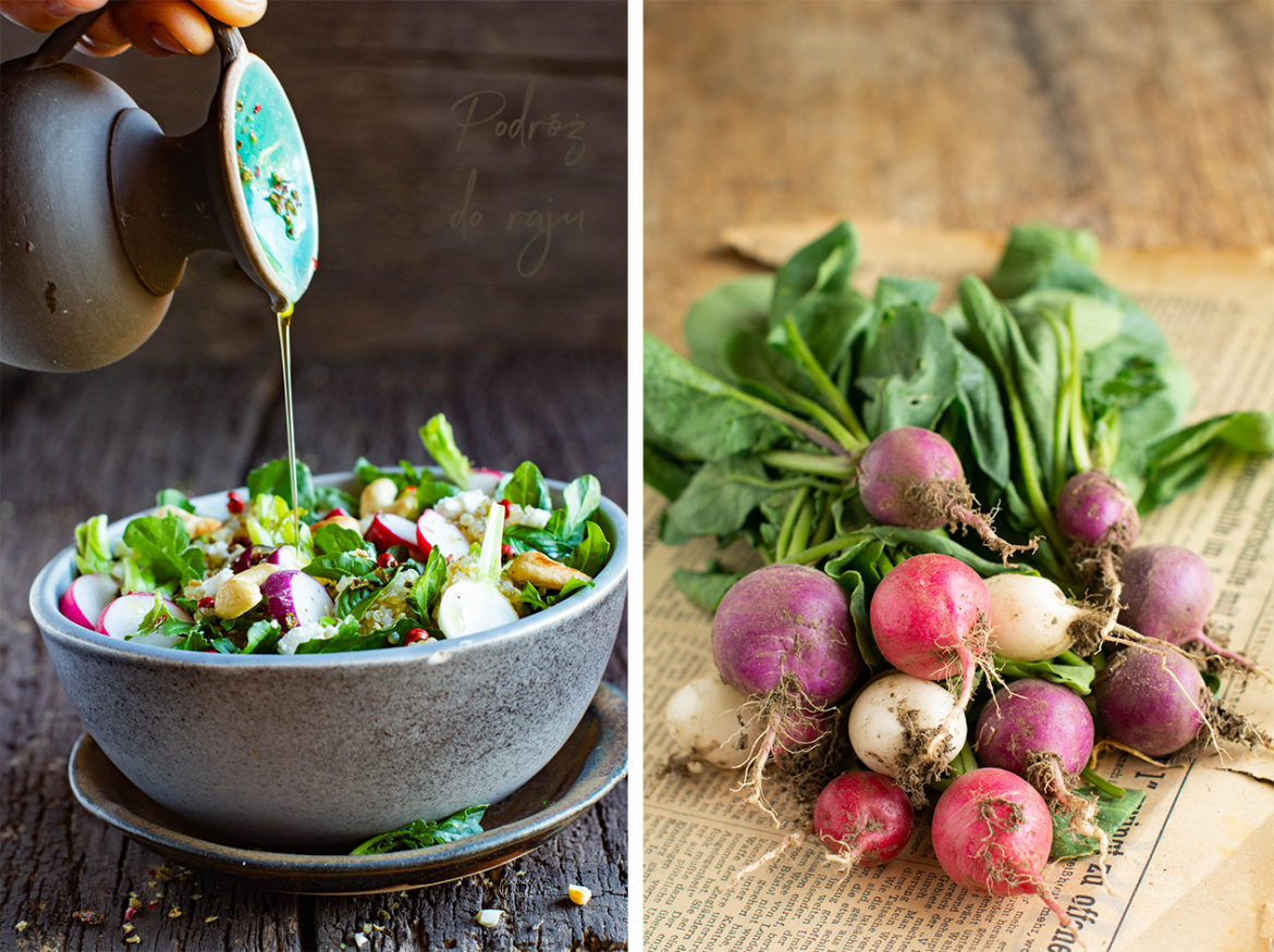 Szybko i sprawnie – taki cel ma ta sałatka. Quinoa można ugotować wieczorem, orzeszki uprażyć wcześniej w większej ilości i przechowywać je w słoiczku. Jeszcze tylko pokroić rzodkiewkę i porwać w dłoniach rukolę 🙂 No i polać dobrym olejem. Ze względu na zawartość quinoa sałatka jest sycąca i odżywcza, więc przybędzie nam energii. Gotuje się bardzo szybko. To co? Robimy sałatkę?