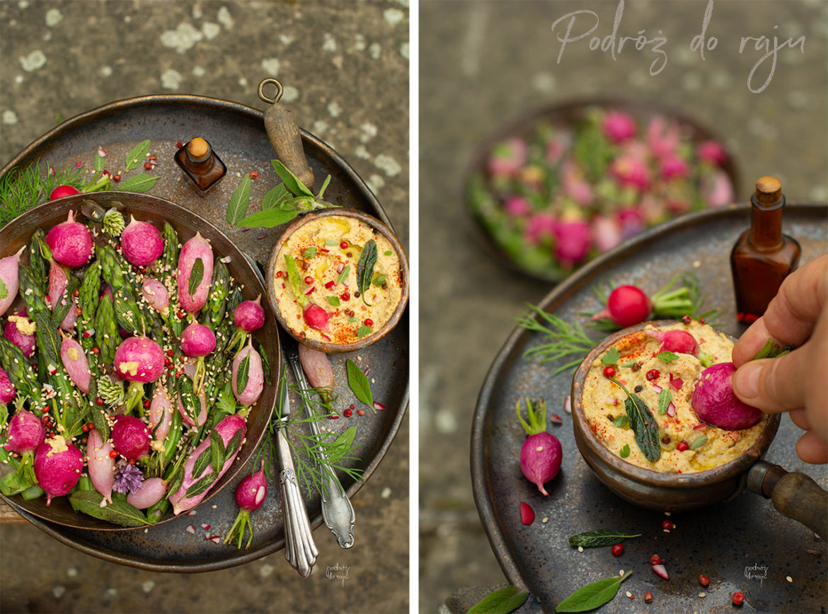 Pieczone rzodkiewki i szparagi z humusem i smażonymi listkami szałwi