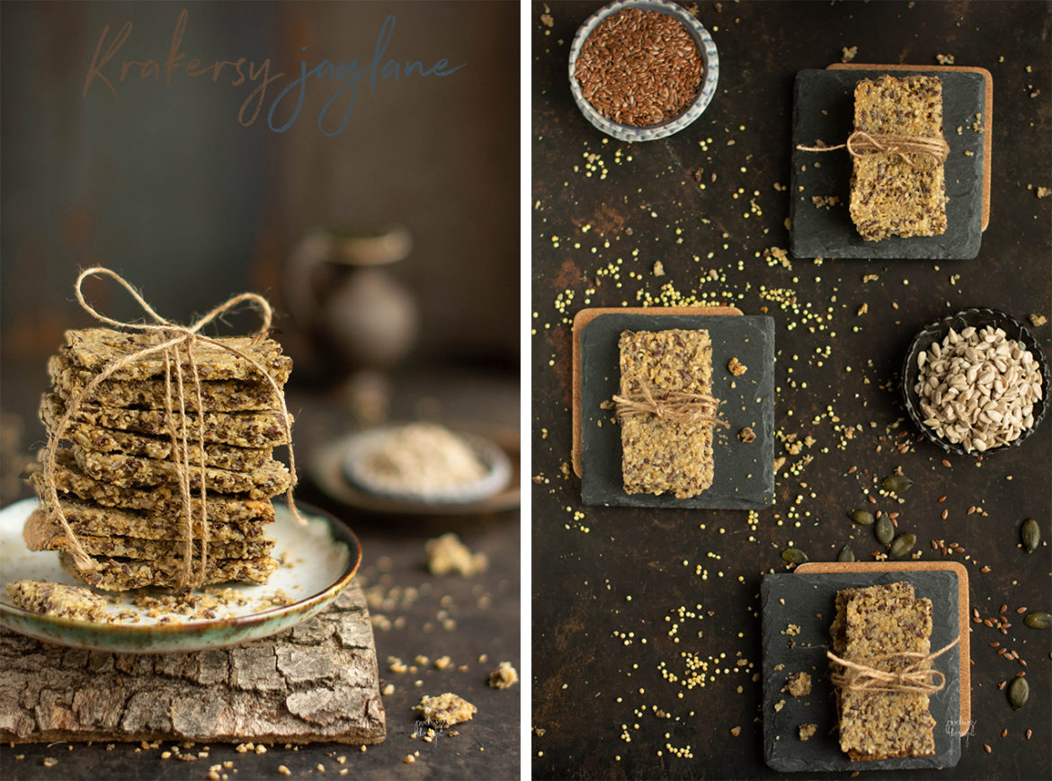 Wspaniałe krakersy! Znikają z talerza jak świeże bułeczki. Chrupiące i smaczne staną na wysokości zadania na każdą okazję. Długo poleżą w pudełku metalowym na ciasteczka. Stanowią sycącą przekąskę jako same do chrupania jak i świetne śniadanie w połączeniu np. z pastą z selera ( przepis TU) czy pastą z dyni i słonecznika ( przepis TU) lub dipem z marchewki ( przepis TU)