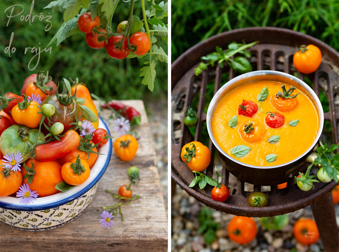 Absolutnie genialna zupa z dojrzałych, sierpniowych pomidorów z ogrodu. Koniecznie pieczone, niekoniecznie żółte, kolor tak naprawdę nie ma znaczenia. Jeżeli nie uprawiasz ogrodu,  kup pomidory na pobliskim targu, prosto od rolnika, tylko takie nadają się na tą zupę.